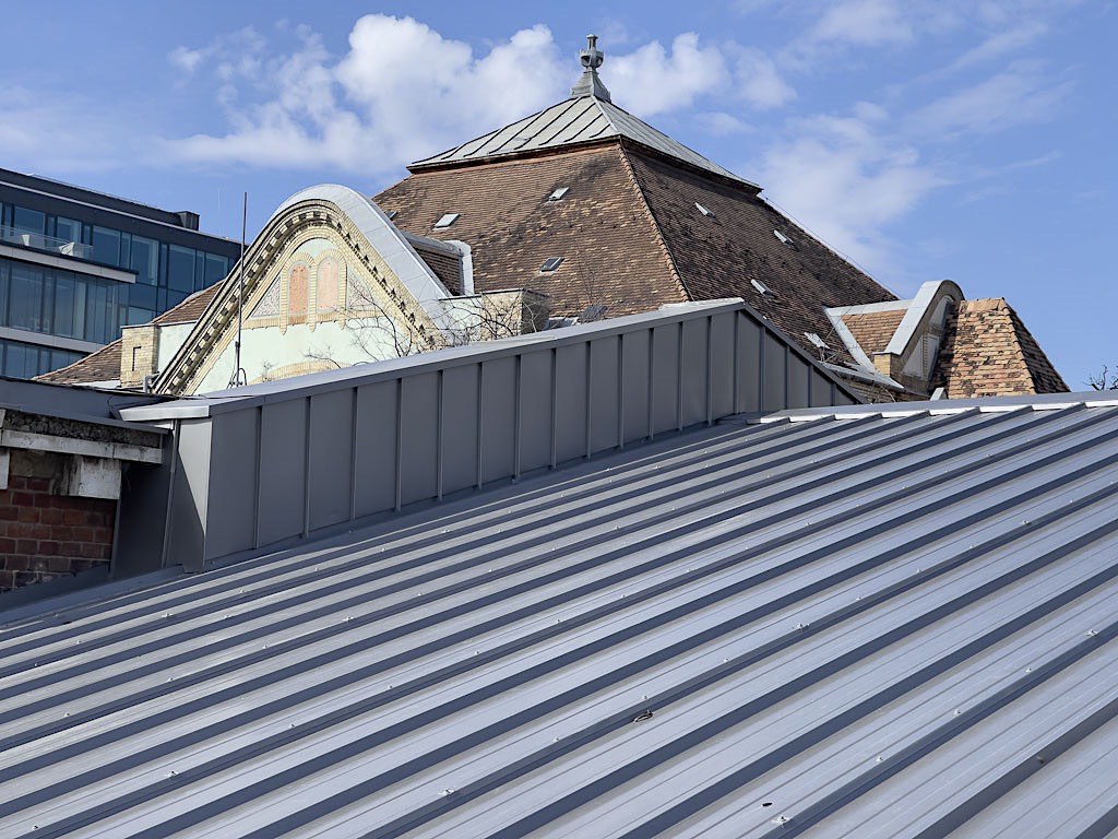 - lécbetétes lemezfedés horganyzott acélból, VM ZINC, hozzá tartozó csatorna rendszer cserével 2150m2-en;